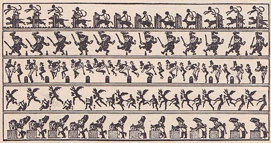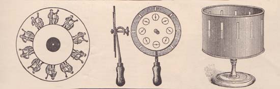 Sea como fuere, y poniendo buen cuidado en no fallar en este escabroso pleito que lleva trazas de no terminarse, vamos a describir por encima el primer dispositivo conocido que reproducía los movimientos por medio de una ilusión óptica. El Zoetropio, o Rueda de la Vida, un juguete mecánico que se presentó en plaza allá por el año 1833, retrataba los movimientos de un caballo al galope con una realidad sorprendente. El aparato consistía en un cilindro hueco, cuya superficie llevaba múltiples ranuras, que giraba sobre un eje vertical. Al interior de dicho cilindro se colocaba una serie de vistas que venían a representar partes de la figura que se deseaba poner en movimiento. Volteando el cilindro y mirando a través de las ranuras, se experimentaba una ilusión óptica perfecta.